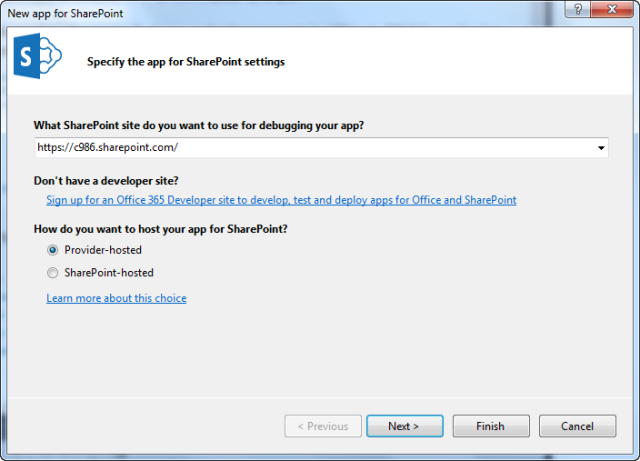 - In the New app for SharePoint wizard, enter the Office 365 SharePoint developer site URL and select Provider-hosted as the hosting model.