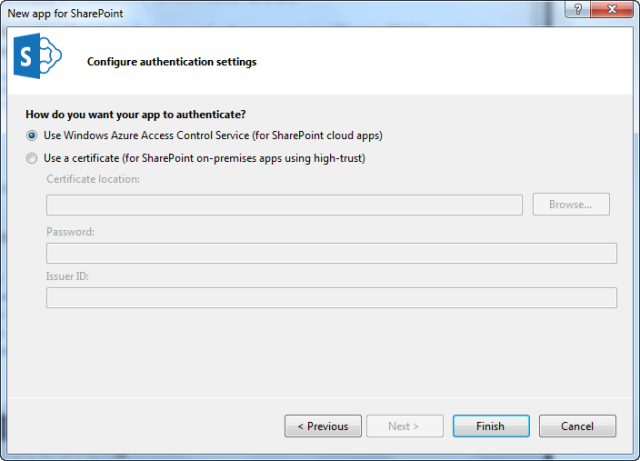 - Select Use Windows Azure Access Control Service (for SharePoint cloud apps).