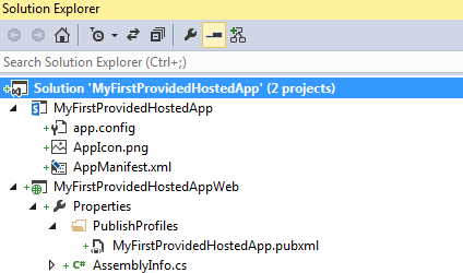 The solution contains the 2 projects MyFirstProvidedHostedApp and MyFirstProvidedHostedAppWeb.
