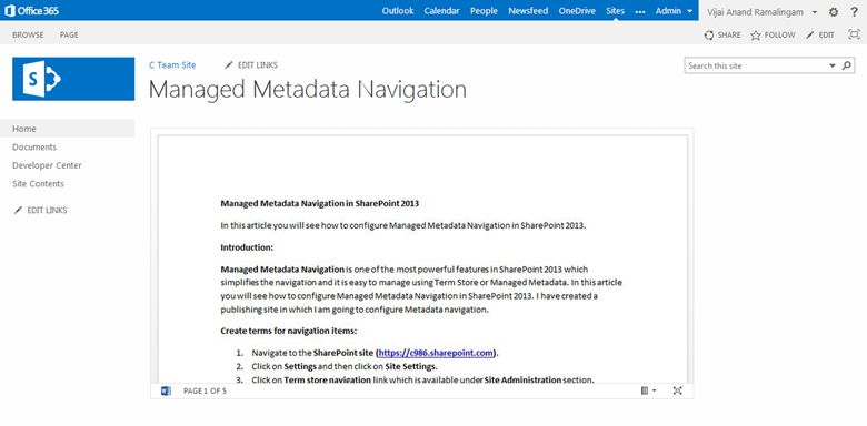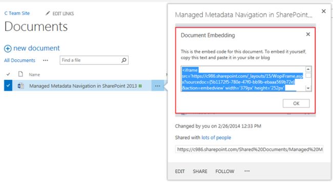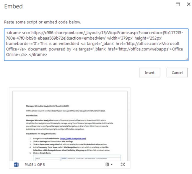 In this article you will see how to embed a Word document in a SharePoint 2013 page.IntroductionEmbedding a Word document content in a web page is one of the new and cool features in SharePoint 2013. It allows you to embed the Word document in the SharePoint page and any update made in the Word document will be automatically updated in the web page. Print to PDF1. Navigate to the Document Library and select the document.2. Select “…”. in the document preview panel then locate the Menu button and then click on the button.3. Click on "Embed Information".4. Copy the embed code for the document.5. Go to "Settings", click on "Add a page".6. Enter the name for the page.7. Click on "Create".8, Click on the "Insert" tab.9. Click on the "Embed Code" button in the ribbon interface.10. Paste the embed code that we copied in Step 4.11. Adjust the height and width.12. Click on the "Insert" button.13. Click on the "Page" tab and then click on the "Save" button in the ribbon interface.14. The Word document is embedded in the web page.SummaryThus in this article you saw how to embed a Word document in a SharePoint 2013 page. Similarly you can embed a PDF, Excel and PowerPoint in the SharePoint 2013 page.