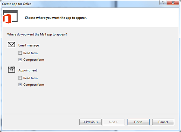 - Select the forms where you want the Mail app to appear as shown below. Click on the Finish button.