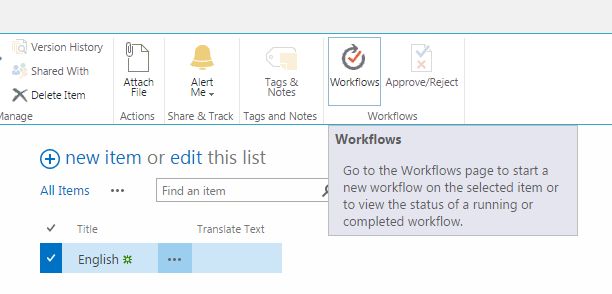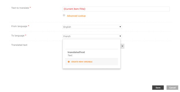 This article shows how to translate text to another language using a NINTEX Workflow in SharePoint 2013 Online.Bing Translation is a new action introduced in NINTEX Workflow for SharePoint 2013 that can be added from the NINTEX store. Using this action text can be translated to other languages. To explain this action I have created a custom list with the following columns.Create Translate Text Workflow1. Navigate to the Office 365 site (https://c986.sharepoint.com/).2. Click on the custom list link in the quick launch bar. Click on the List tab and then click on the NINTEX Workflow button in the ribbon interface.3. Drag and drop a Bing translation action from the Integration section.4. Click on the down arrow and then click on Configure.5. Select the Text to translate (select the current item Title field), From language, To language and store the translated text in a workflow variable (create a new workflow variable and name it “translatedText”). Click on the Save button.6. Drag and drop an Update list item action from the Libraries and Lists section.7. Click on the down arrow and then click on Configure. 8. Set the workflow variable “translatedText” value to the current item “Translate Text” field.9. Click on the Save button.Publish the workflow1. Click on the Publish button in the ribbon interface.2. Make sure the Title is set; optionally you can set the values for Description. Select the Task List, History List and Start options.3. Click on the Publish button. The workflow will be validated.4. The workflow is published successfully.Test the workflow1. Navigate to the custom list.2. Select the item and then click on Workflows in the ribbon interface.3. Click on Translate Text Workflow and then click on the Start button.4. After a few minutes the text will be translated and it will updated in the “Translate Text” field as shown below.SummaryThus this article showed how to translate text to another language using a NINTEX Workflow in SharePoint 2013 Online.