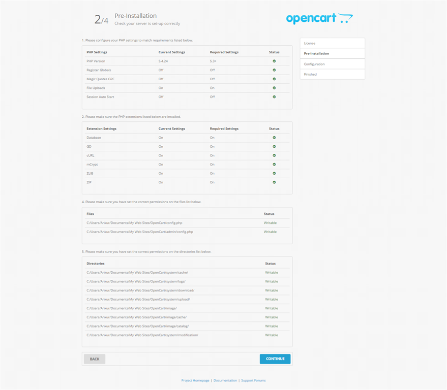 Once you click 'Ok' it will run the opencart setup wizard according to the following screen. Click on 'CONTINUE' on License Agreement page.