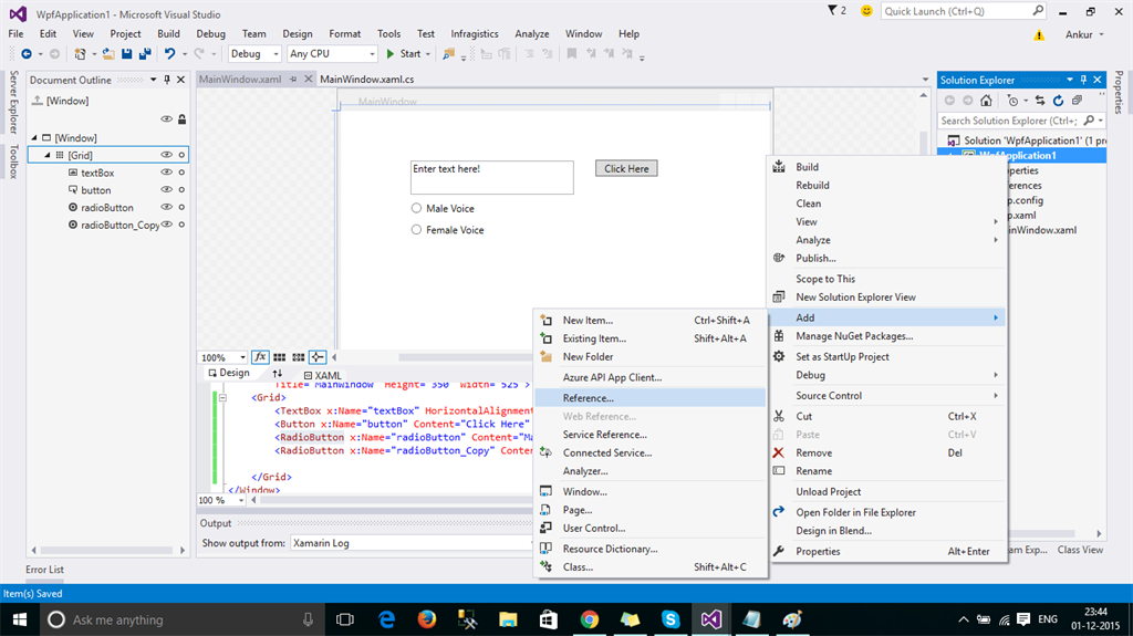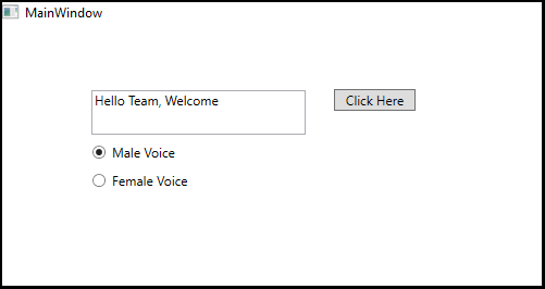 Step 5: Now run the application and enter some text in textbox and check on 'Male Voice' and hit 'Click Here' Button. Also check for 'Female Voice' option.