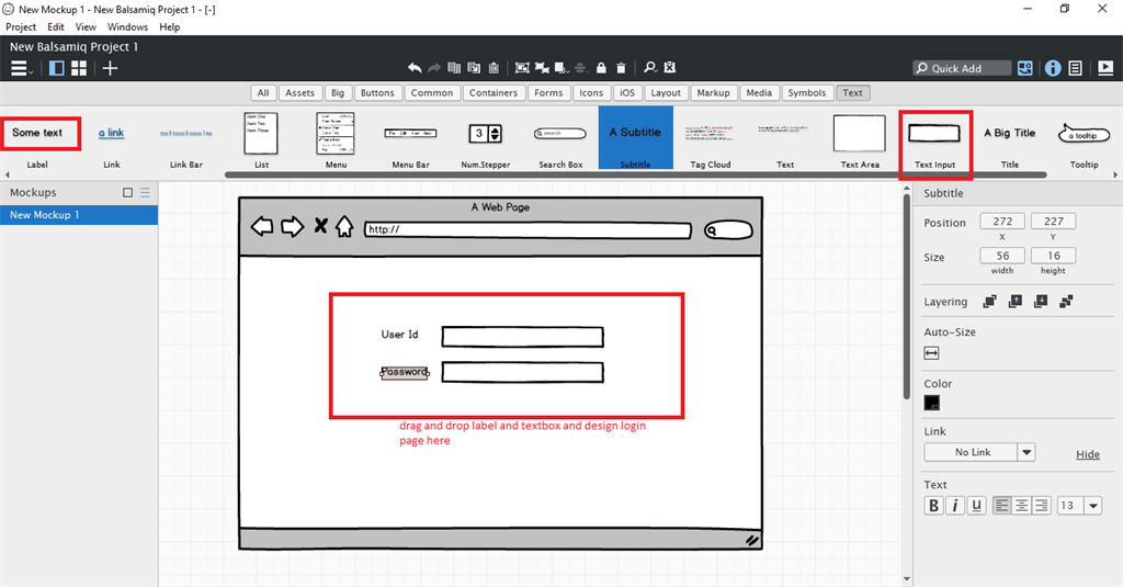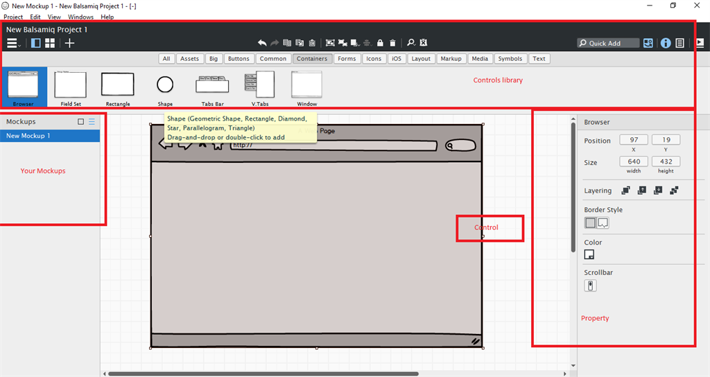 This interface is similar to Visual Studio, just drag and drop controls you want to use in wireframe, here we are going to select container, then browser first, and then select 2 labels and 2 textboxes for User Id and Password.