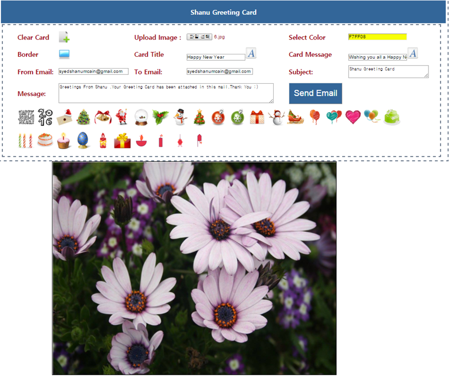 - Save and Send to Email: The final created Greeting Card can be saved to the application root folder. Also, send the card to a user entered email address.