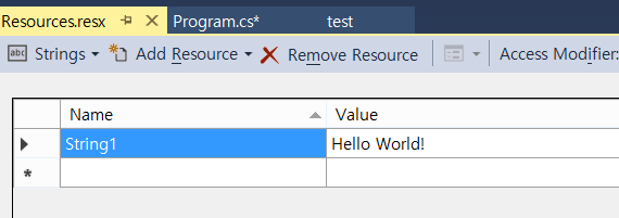 In Createwindow method the default code will be added to add the Text to the window and loading the text content from the resource file. Note to see our resource string we can double click on “Resources.resx” file from the Solution Explorer. If we want we can add more string or we can change the Hello World text as we like to display different text.