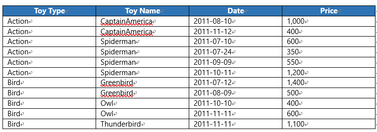 For example, let’s consider the following example here. I have Toy Type (Category) and Toys Name with sales price per day.