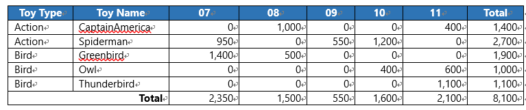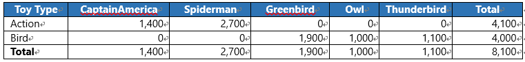 Here we can see this is much easier to view the Total Sales per Toy Name. Here in Pivot we can also add the Column and row Total. By adding the Total it will be easy to find which item has the highest sales.