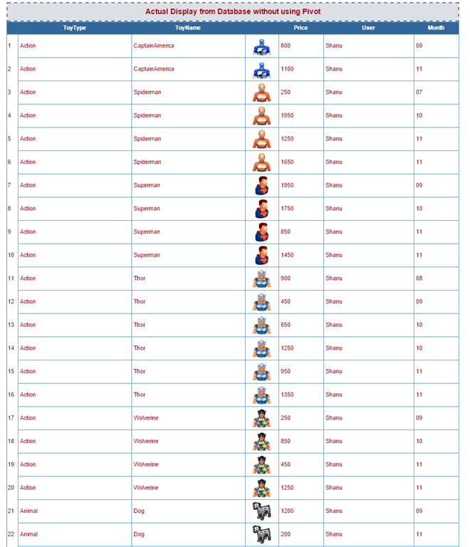 In our database we insert every record of toy details with price details. The raw data which inserted in database will look like this.