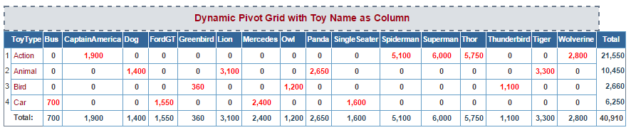 After binding the columns I will bind all the Toy Type as rows and for each Type type and Toy name I will display the summary of price in each appropriate column.