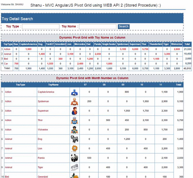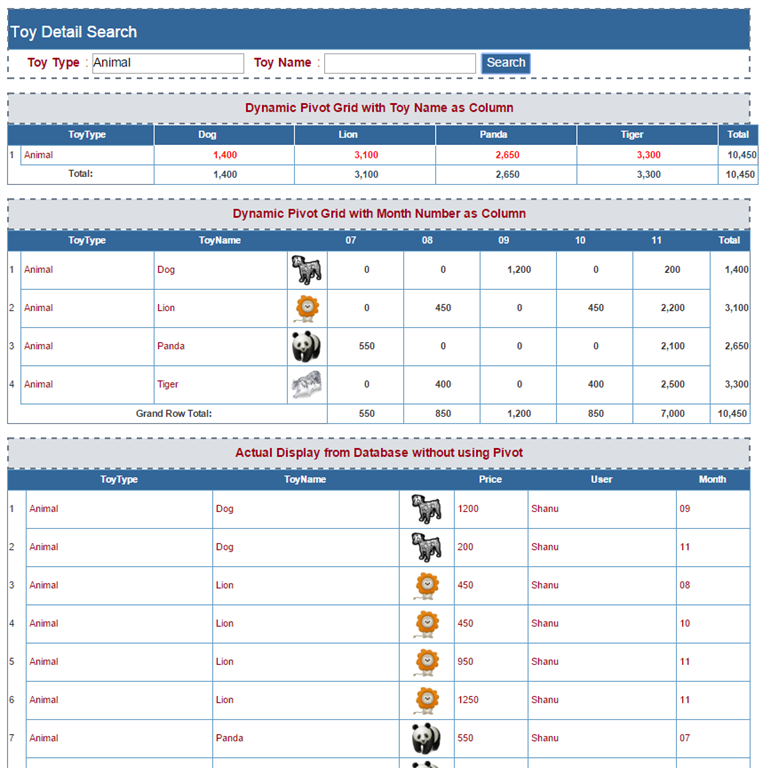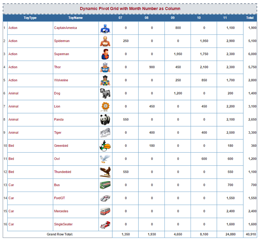 The same logic as above has been used to calculate and bind the Pivot report for Monthly Toy Name summary details. Here we can see that it will look like this as in Rows I will bind Toy Type (Toy Category) Toy Name, Toy Image as static and all the Month Number in Columns Dynamically. Same like above function I will calculate all the Toy Summary price per Month and display in each row with Row Total, Column Total and Grand Total.