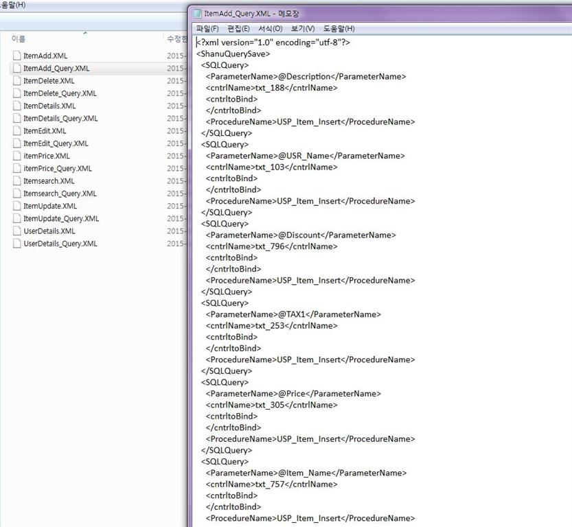The ItemAdd_query.XML file has all the details of a form Stored Procedure name with parameters and Control Names.