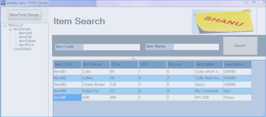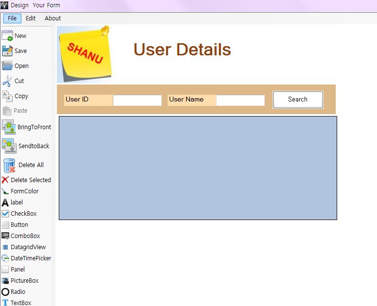 Now for example the user can add a DataGridView and a Button Control at runtime with a TextBox for searching the user by UserCode and UserName.