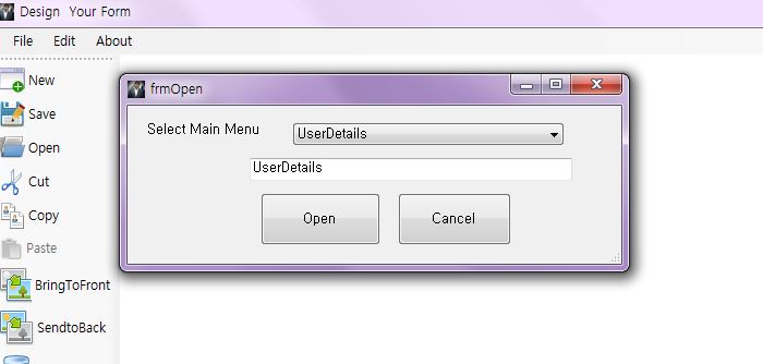 In the Toolbar the user has an option to open an existing form for modification. You can refer to the following image. When the users click on the Open Toolbar button a list of menu names (which is our form name) will be displayed. The user can select their form name from the list that needs to be opened for modification. If the user knows the form name then they can directly enter the form name in the TextBox and click Open to modify the existing form.