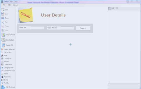 - In the left side we have the Tool Menu where the user can add a TextBox, Label, Button, Panel, DataGridView and so on at runtime to design the form.