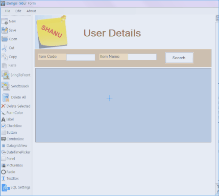 Toolbar: Here we can see all the list of controls that can be added to the form at runtime. There are other features, like Create New Form, Save Form, Open Form, Cut, Copy and Paste Controls. Finally the control you can see is the SQL Setting that is a very important tool to set our form controls with a Stored Procedure to do our CRUD Operations.