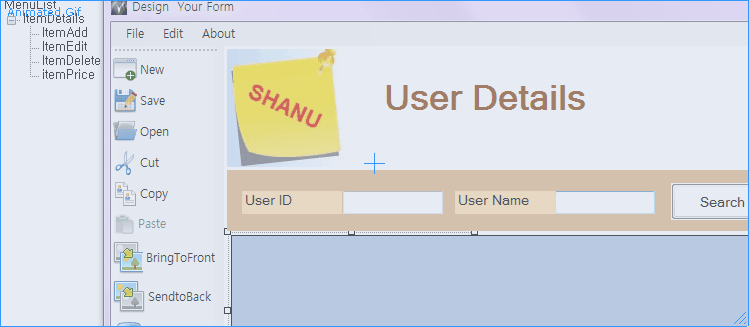 In the Toolbar the user has the option to save the modified form to be viewed from the main screen. You can refer to the following image. When the users click on the Save Toolbar button a list of Main Menu names will be displayed, here all the previously saved file names (I will be using the file name as the Menu name to be displayed in the main screen Treeview). If users want to save the form as a submenu to an existing menu then the user can select the main menu name and enter the new form name to save. If the user wants the form to be a main menu then he can select “Select” from the ComboBox and enter the new form name. Once the form is saved, the menu will be added with the new form name on the main screen.