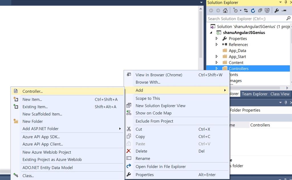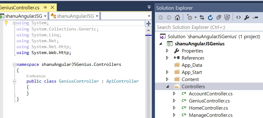 As we are going to create our WEB API Controller. Select Controller and Add Empty WEB API 2 Controller. Give name to Web API controller and click Ok. Here for my Web API Controller I have given name “GeniusController”.