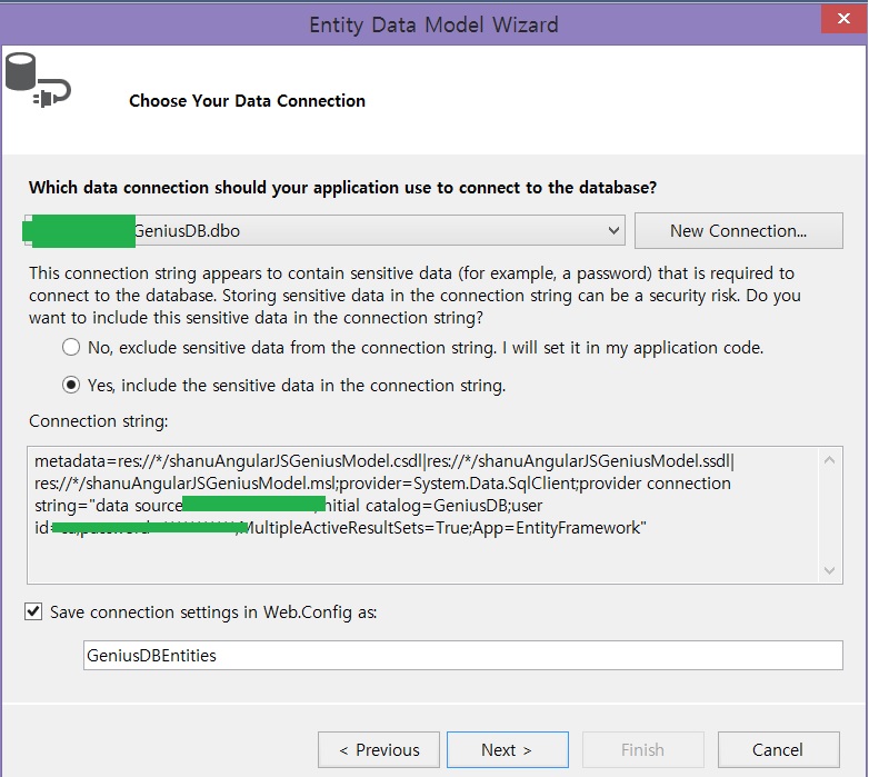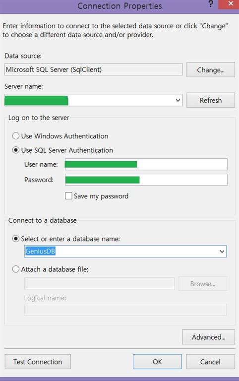 Here we can see I have given my SQL server name, Id and PWD and after it connected I selected the database as GeniusDB as we have created the Database using my SQL Script.