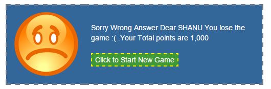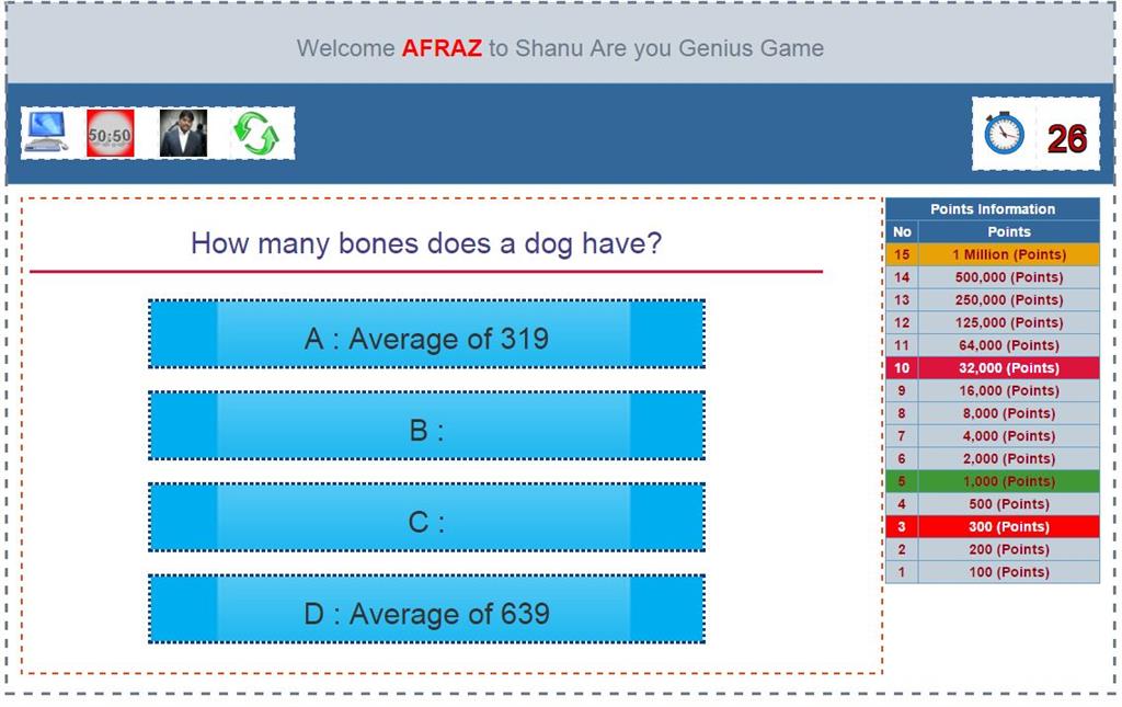 Ask to Shanu: (If player click this option then SHANU (The Program creator) will display the Answer. Note only 90% of answers will be correct. Remaining 10% might not be correct so Player has to decide weather he/she can pick the answer or not.)