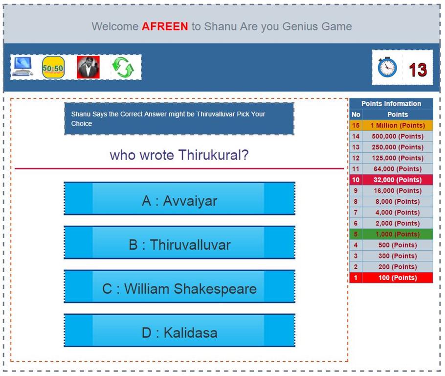 Here we can see when I click on the Ask to computer lifeline. The computer will display the answer at the top as “Shanu says the correct Answer might be “Thiruvalluvar” pick your choice.