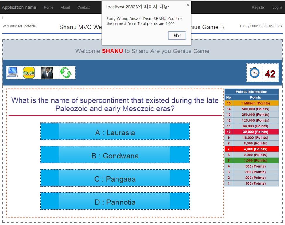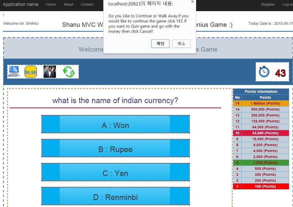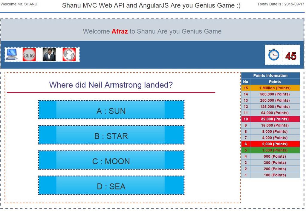 This game I have created by the inspiration of the “Who Wants to Be a Millionaire”. It is a world famous TV Show. In India, similar TV Show has been telecasted in Tamil Language as “Neengalum Vellalam Oru Kodi “ and in Hindi language as “Kaun Banega Crorepati”. On the Internet we can see plenty of similar online games and mobile app games mostly created with flash programming. I thought to make things simpler by creating one with MVC using AngularJS and WEB API. I love to make games rather than play games. So to make new games now I have started playing games. I have followed the same rules to make this game and instead of Money ($) I have used Points and named my game as “