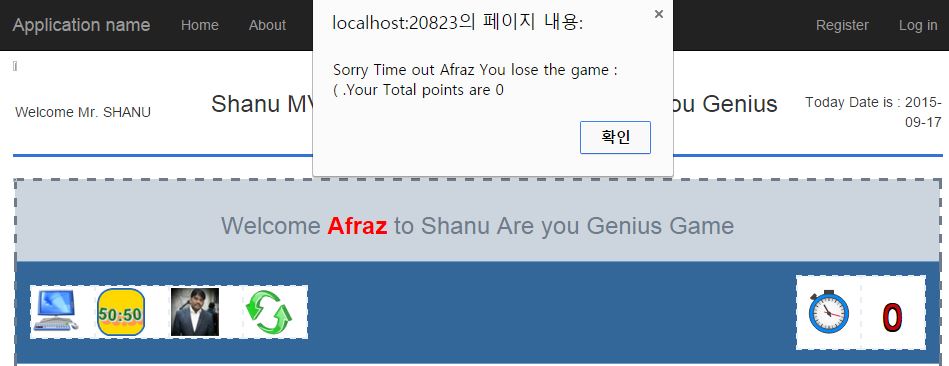 When the counter value is 0, then I will stop the timer and display the alert message as you lose the game and display the players last points value. Here we can see the points as 0 since in my first question I didn’t answered the question within 45 seconds.