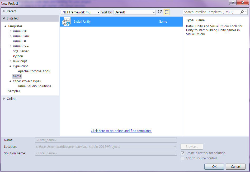 Click New, then Project and select Game. If you didn't install Unity in your computer you can install it from here. Select Install Unity and click OK.
