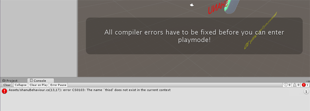 Console Window: We can see the error messages of our C# Script from the Console Window. For example, I have misspelled the “this” keyword with “thisd”, we can see the error message at the bottom of the Console window and also when we click on the Game window we can see the error message as in the following screenshot: