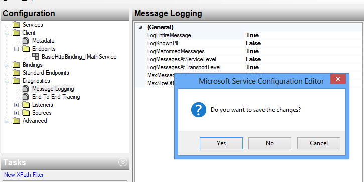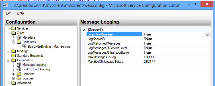 Expand the Diagnostics and click on Message Logging. Now, set LogEntireMessage to true and close the editor.