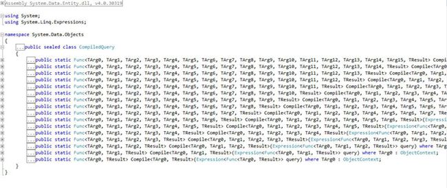 To create a compiled query, we have a static method named "Compile" in the "System.Data.Objects.CompiledQuery" namespace. It is a static function with 16 overload versions and it returns a generic "Func" delegate type. See the list of its definitions.