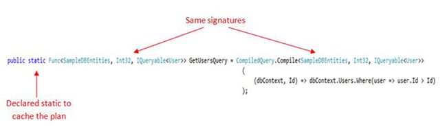 - The delegate variable we use to cache the query, will have the same signature as that of the Compile method, as it will act as a pointer to the function or we can say it is basically the return type of the method. It's like we have an INT32 return type of a function and storing it in an INT32 type static variable.
