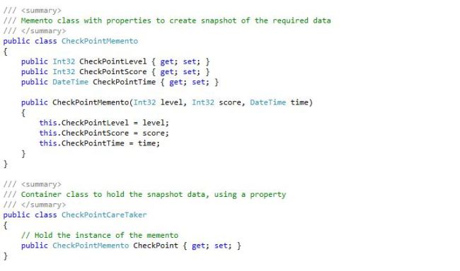 This class is used to store the snapshot of the Originator class data. In our case, it will be the CheckPointMemento class, only with properties, for which we want to store the data, in other words for each of the properties that we want to have in the snapshot, we create a property in the memento class.