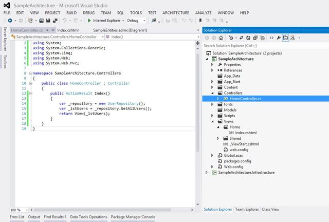 Now let's add a controller, its corresponding view, and make a call to the repository GetAllUsers method. In order to access the repository, we need to add a reference to the Infrastructure project. So add the reference to it and call the method as: