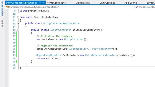 So for this, we add a class named UnityContainerRegistration and register the dependencies. We add this class to the main web project since this is where we need the dependencies to be resolved.