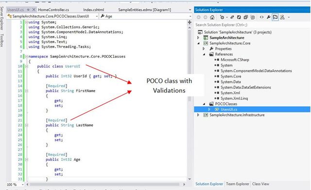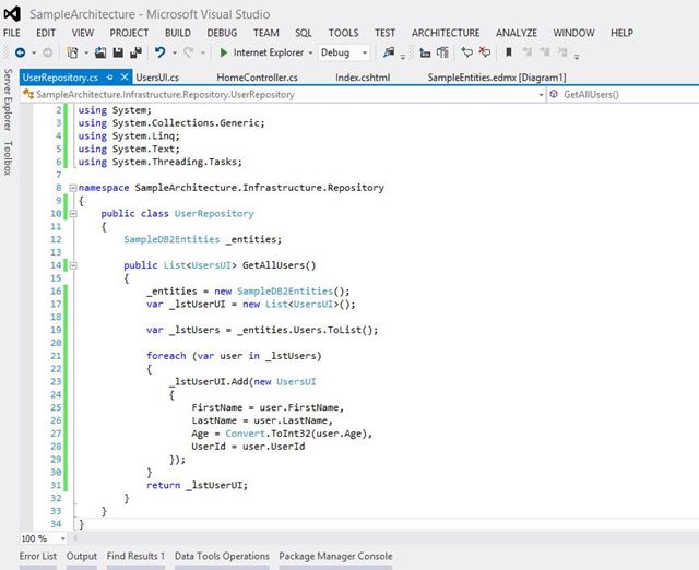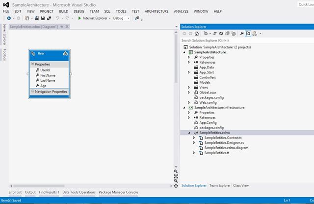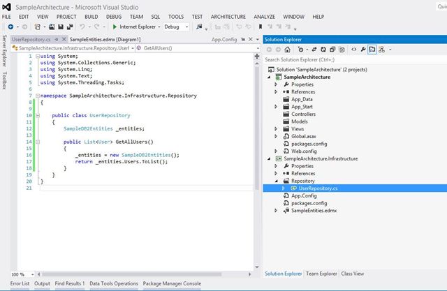 Next we will display some sample data on a page, from a database. For this, we will create a sample database and use the Entity Framework database first approach. So let's add an .edmx and update it from a sample database. But, adding this edmx to the same project does not make good sense, since the models will be tightly coupled to the UI layer. So what we will do is we will add a new project layer of type class library, with the name SampleArchitecture.Infrastructure and add the .edmx to it. See the code below: