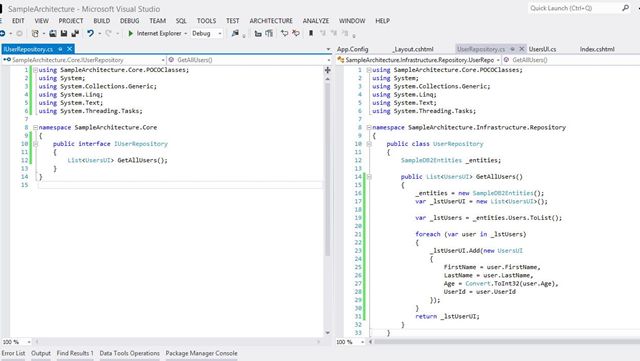 Next, we add an interface named IUserRepository and add the definition of the GetAllUsers method. Implement this interface on the UserRepository class. Again the same question, where to add the interface? And the same concept to answer this question, this is a re-usable component and should be an independent component. So we add it to the SampleArchitecture.Core project. Makes sense, doesn't it ? So the code changes to: