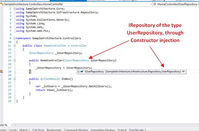 Finally, we change our Controller to receive the dependency of UserRepository, using the Constructor, in the form of IUserRepository (as it implements this interface). This dependency gets resolved using the Unity container we registered above.