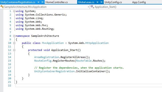 Next, we initialize this container in the Global.asax file. So when the application is begun, it will register all the dependencies in the container.
