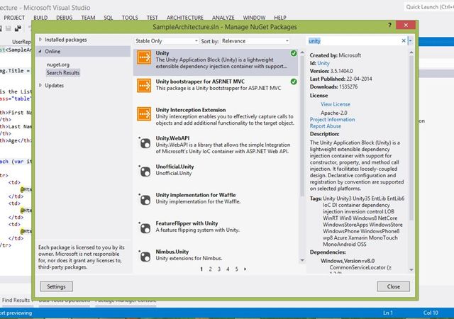 Now the controller needs the instance of the UserRepository that will be provided by the UnityContainer. As the name suggests, the Unity container is like a container responsible for providing the required dependency to a class. In order to use the Unity container, we add references to the Unity DLLs using the Nuget Package Manager.