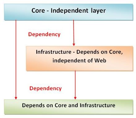 - Web layer will be dependent on both the Core and the Infrastructure layers, for the use of POCO classes and the repository classes. This becomes Layer3 of our discussion earlier.