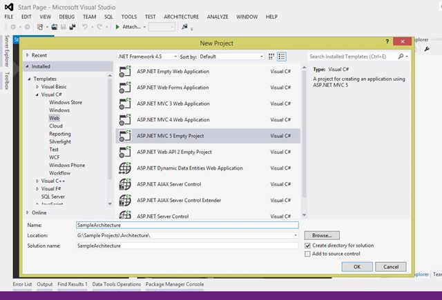 Let's try to understand by creating a new MVC application. We will create an application with tight coupling and try to convert it into an Onion Architecture with a system of loosely-coupled components. Fire up your Visual Studio and add a new project of type MVC.