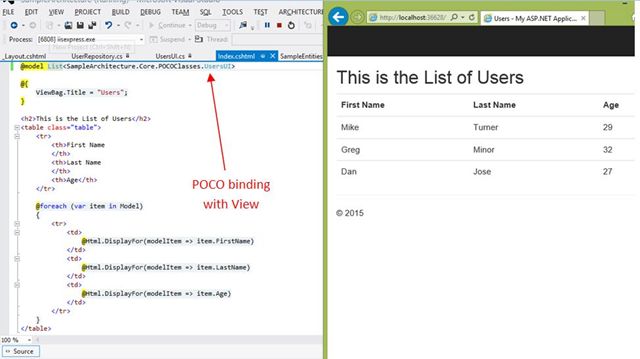 Next, we change the repository method to use the POCO class and return it to the Controller and bind it with the View.