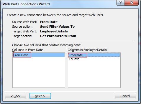Step 10: In the next dialog, select “From Date” from the first box, and “FromDate” from the second box and click "Next". Then click "Finish".