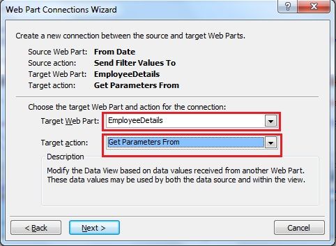 Step 9: In the next dialog select Target Web Part (if multiple Web Parts are added to the page) and change the target action to “Get parameters from” and click "Next".