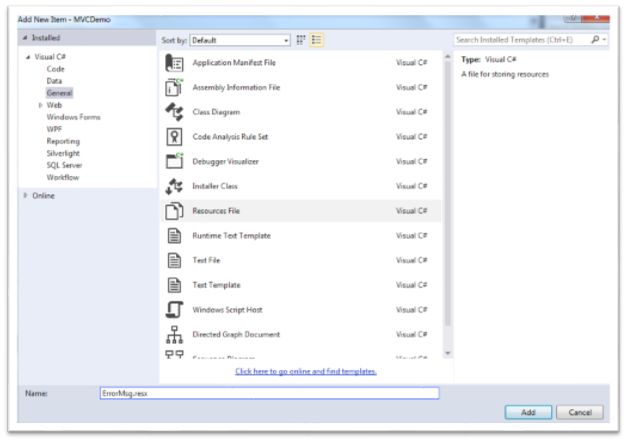 - Add a Resource File In My Case named it ErrorMsg.resx.