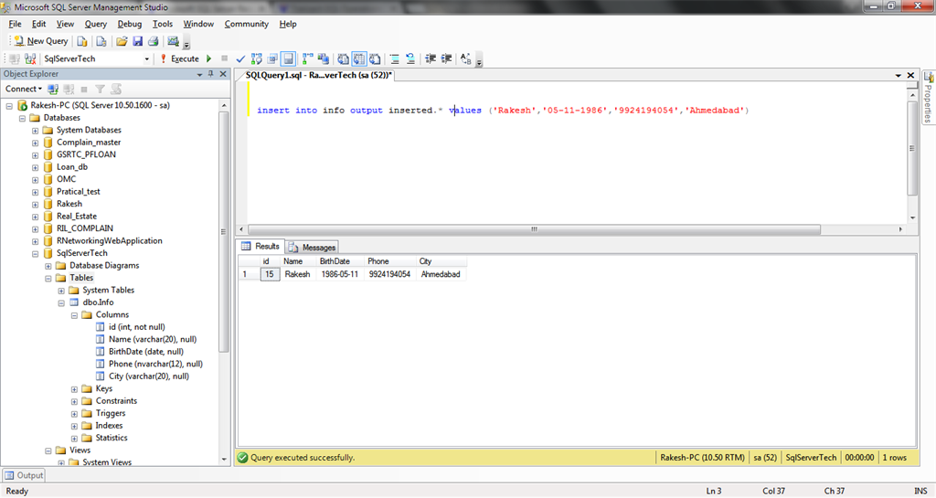 - insert into info output inserted.* values ('Rakesh','05-11-1986','9924194054','Ahmedabad')