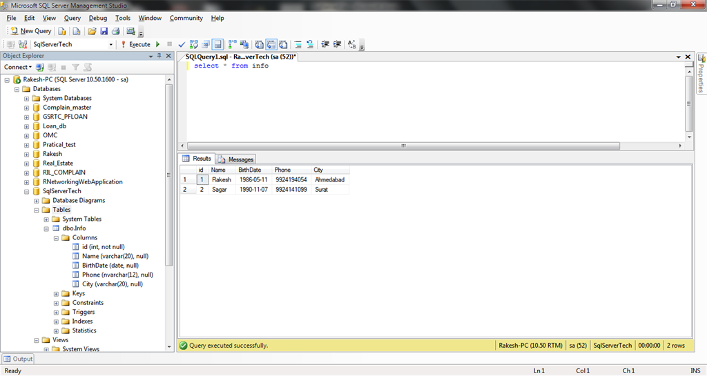 - insert into Info values ('Rakesh','05-11-1986','9924194054','Ahmedabad')