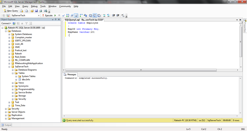 - Create table TableName (columnName1 datatype, columnName2 datatype )